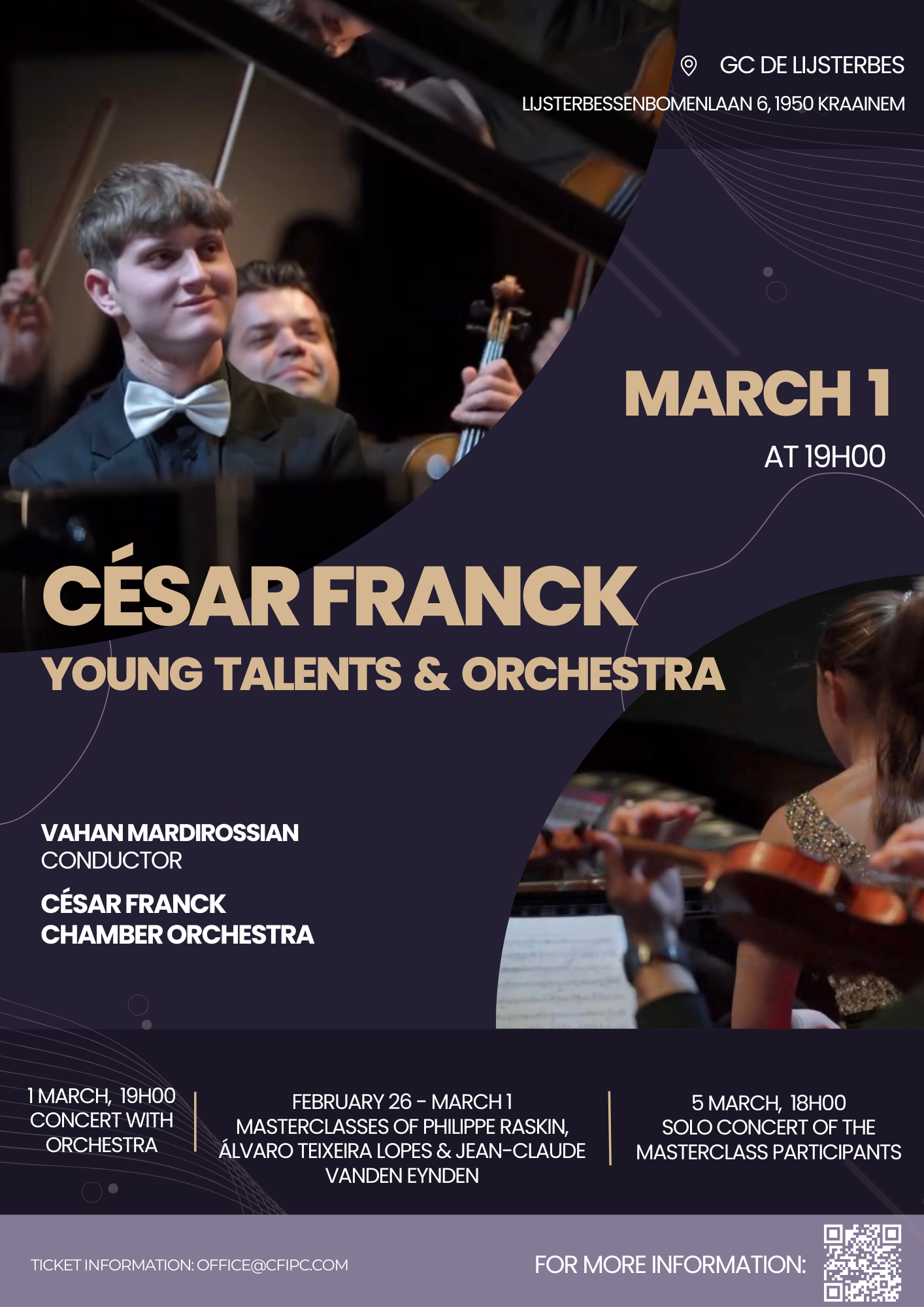 1 meeting with Maestro Vahan Mardirossian, conductor of the orchestra, or 1 extra lesson with Prof. Teixeira Lopes, Prof. Vanden Eynden or Prof. Raskin, if you choose not to play with orchestra